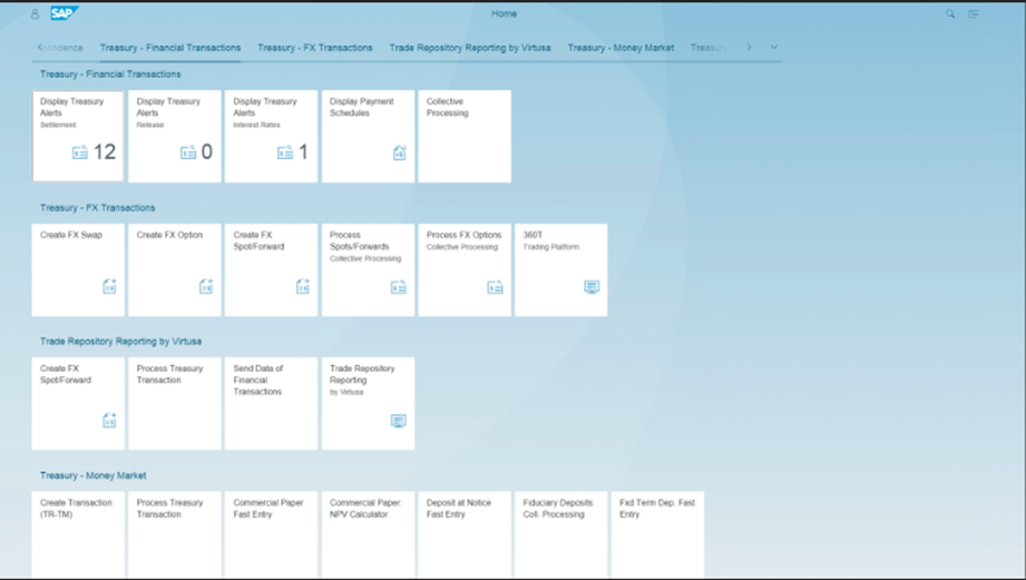 SAP Fiori es la nueva plataforma web donde SAP disponibiliza una suite de aplicaciones para cada uno de sus módulos. Así mismo para TRM cuenta con una serie de aplicaciones o APPs del tipo transaccional y del tipo reportería.
